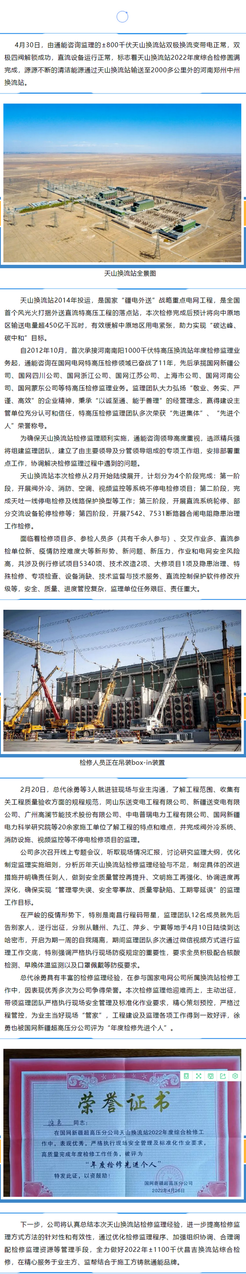 不忘監(jiān)理初心使命 奮戰(zhàn)疆電外送工程——通能咨詢圓滿完成2022年天山換流站年度綜合檢修監(jiān)理