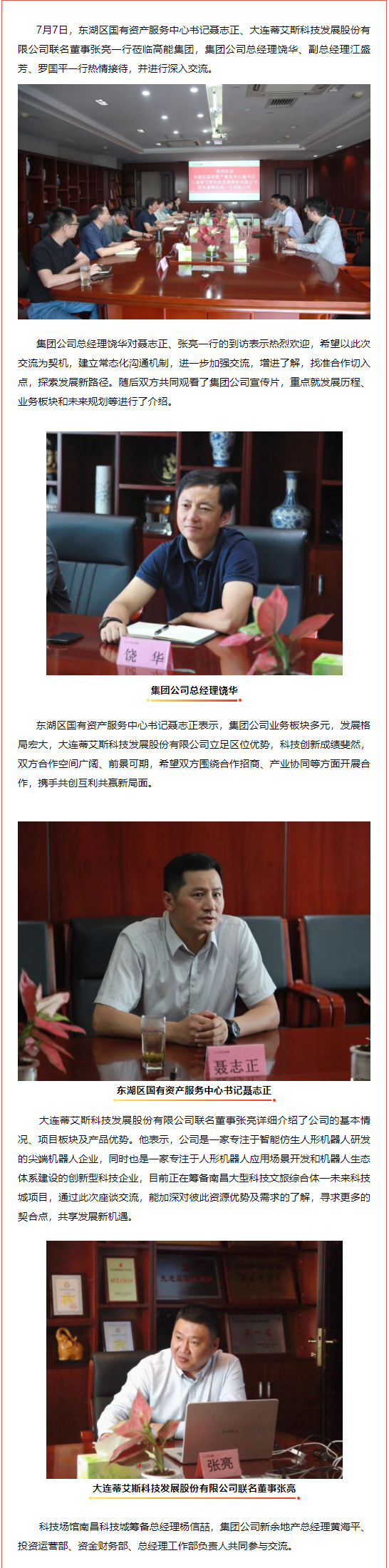 東湖區(qū)國(guó)有資產(chǎn)服務(wù)中心書記聶志正、大連蒂艾斯科技發(fā)展股份有限公司聯(lián)名董事張亮一行蒞臨高能集團(tuán)參觀交流