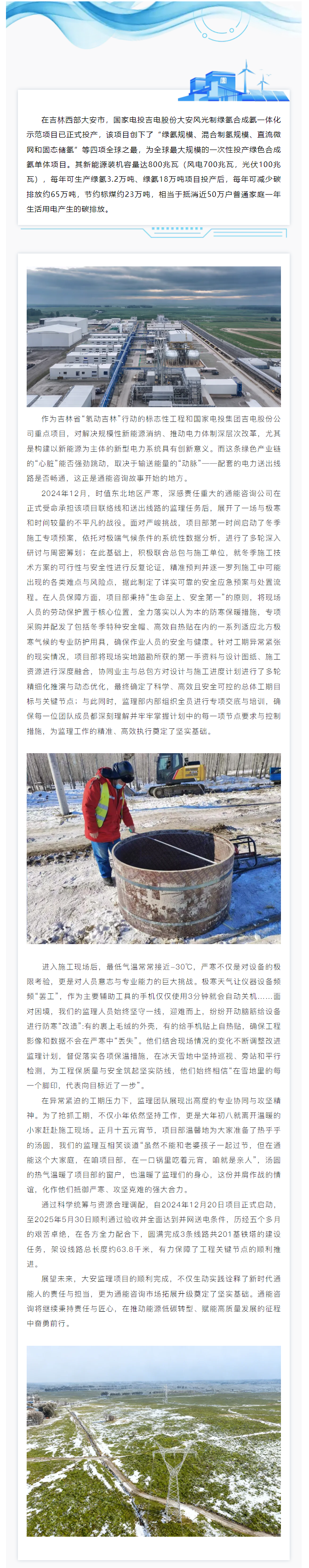 護(hù)航全球最大單體綠氫項目 助力東北能源轉(zhuǎn)型——通能監(jiān)理完成國家電投大安一體化示范項目線路送出工程